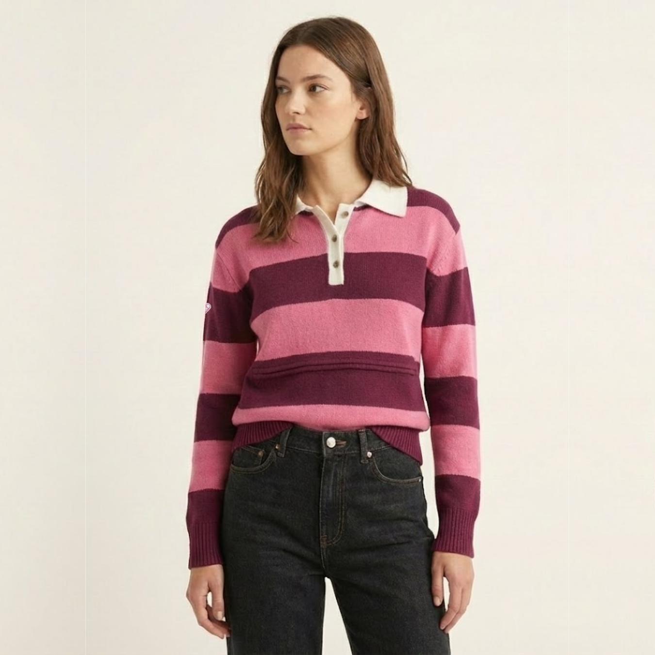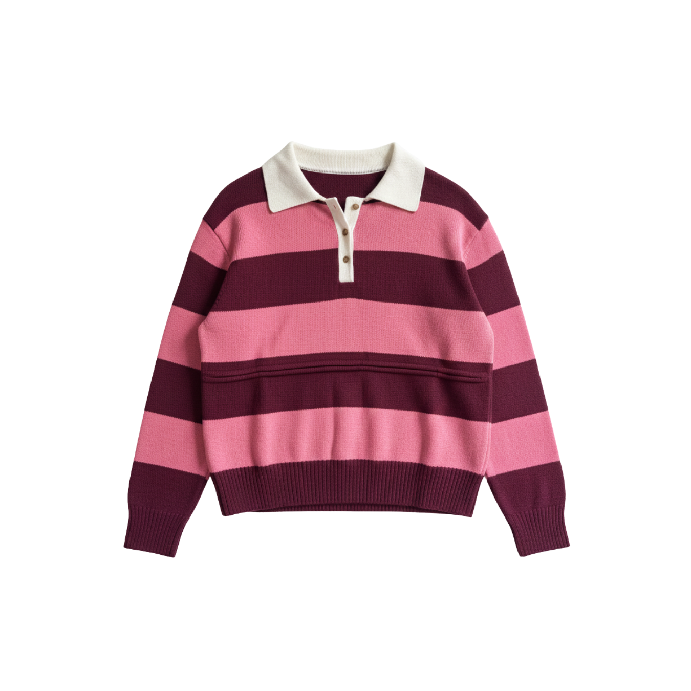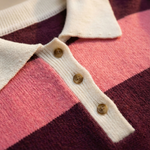 • Playful pink and red stripe pattern with a contrast collar