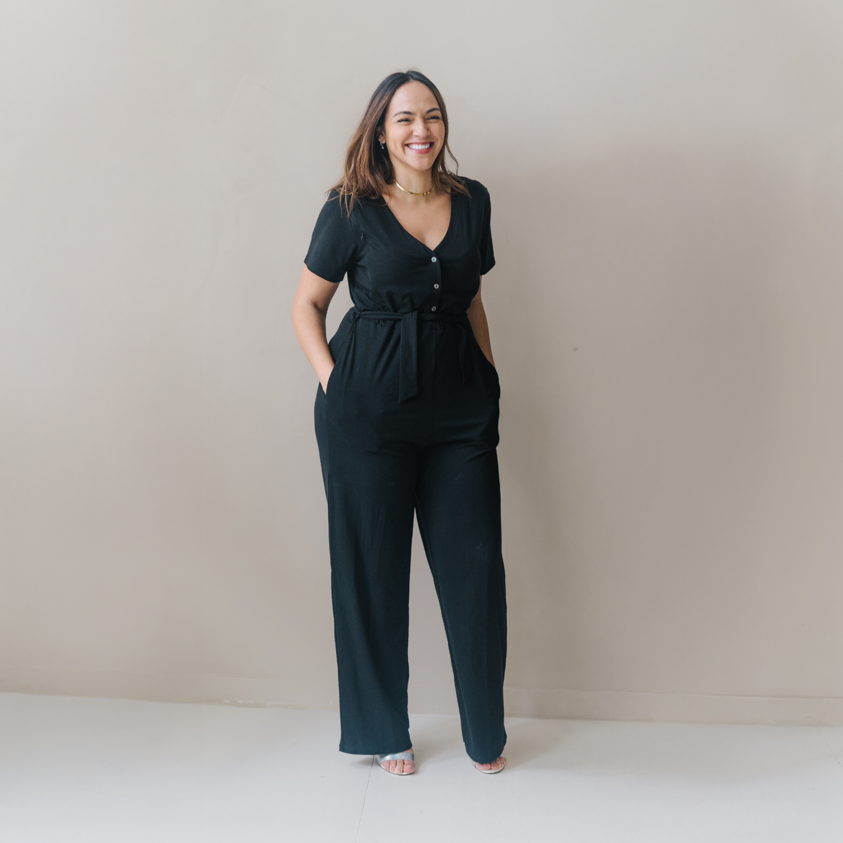 Un capo elegante e senza sforzo per ogni fase della maternità. Realizzata in Tencel™ Lyocell sostenibile, questa tuta è morbida, traspirante e delicata sulla pelle, con un bellissimo drappeggio che valorizza ogni forma. Progettata per muoversi con voi, combina comfort e stile in egual misura: perfetta sia che vogliate vestirvi bene sia che vogliate rimanere casual.