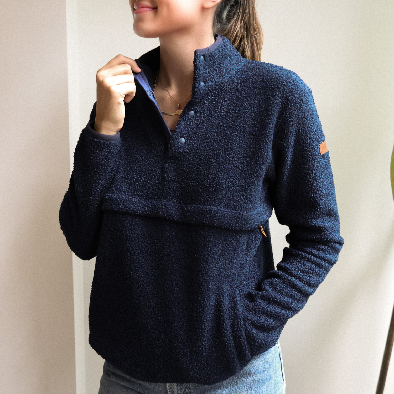 Gemaakt van hoogwaardig, duurzaam gerecycled polyester dat je helpt warm te blijven terwijl je borstvoeding geeft.
